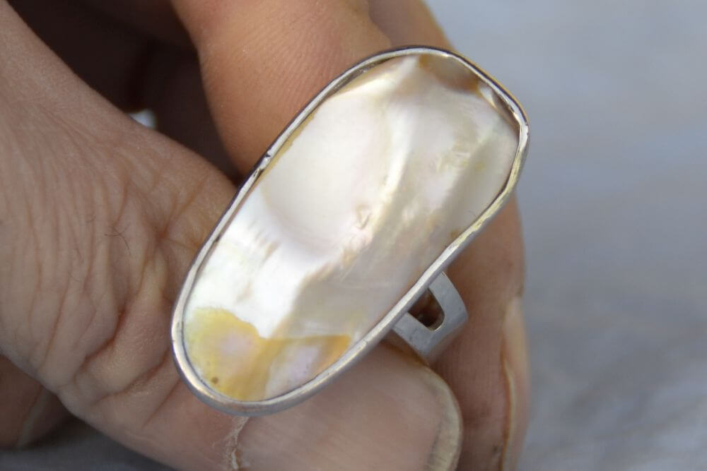 Der Fingerring Perlmutt ist speziell in seiner Verarbeitung. Er ist im Durchmesser verstellbar.